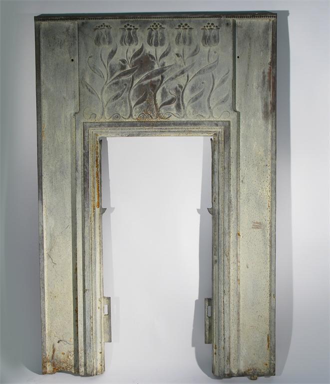 A Steel & Garland cast iron fireplace the design attributed to Charles Robert Ashbee, cast in low relief with Art Nouveau tulip flower stems, cast regd 359274, dated 29.3.01 122cm. high x 80cm. wide