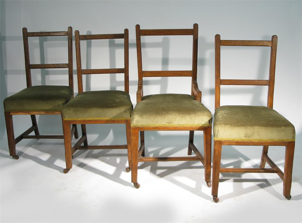A set of Blythe & Sons oak dining chairs comprising one carver and five chairs, with green padded seats applied labels 91cm. high