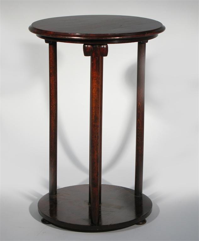 An Austrian Secessionist mahogany side table the design attributed to Josef Hoffmann, three columns supporting circular top with ball shaped supports, on three pad feet unsigned 70cm. high Literature