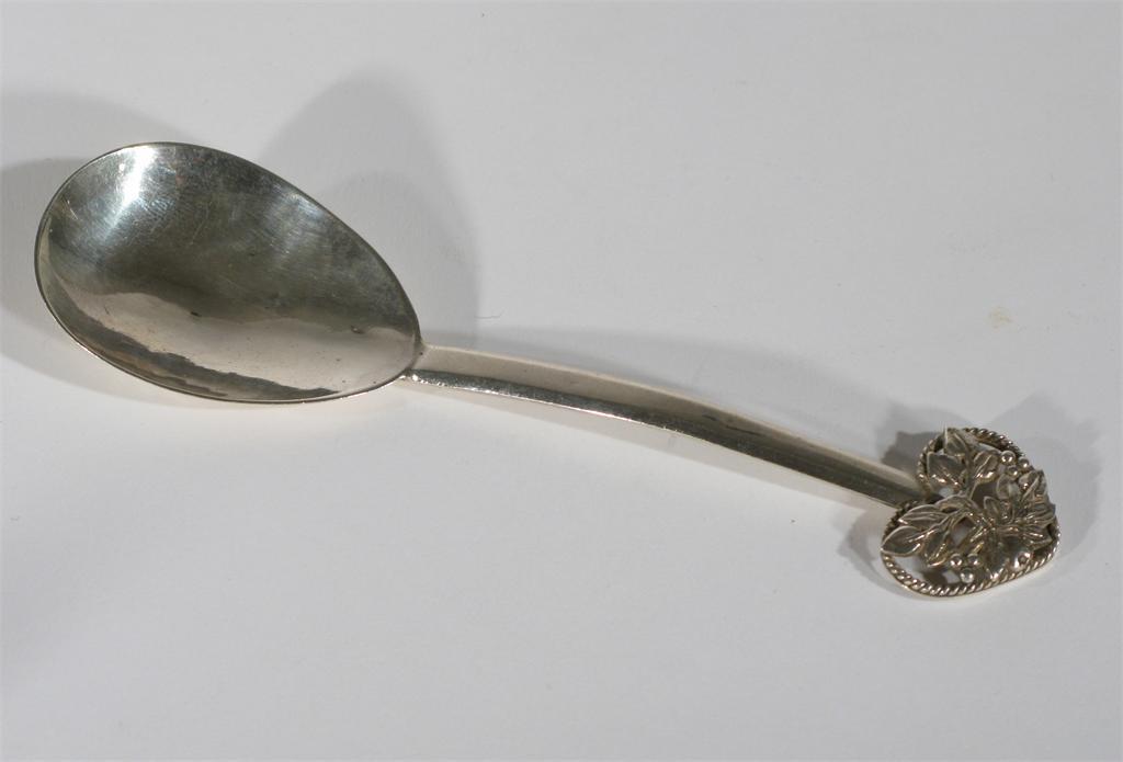 An Alfred Pairpoint, Francis Pairpoint and Walter Pairpoint Arts and Crafts silver spoon with hammered heart-shaped bowl, the terminal with fruiting foliage amongst rope-twist border stamped marks, London 1925 14cm long