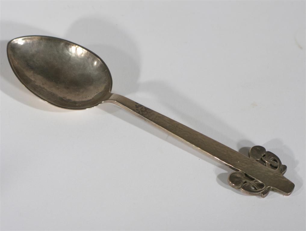 A Liberty & Co Cymric silver spoon designed by Archibald Knox, model no.362, the stem cast with foliate terminal stamped marks, Birmingham 1904 16cm. wide Literature Stephen Martin Archibald Knox ARTMEDIA PRESS, page 215 for comparable spoons illustrated.