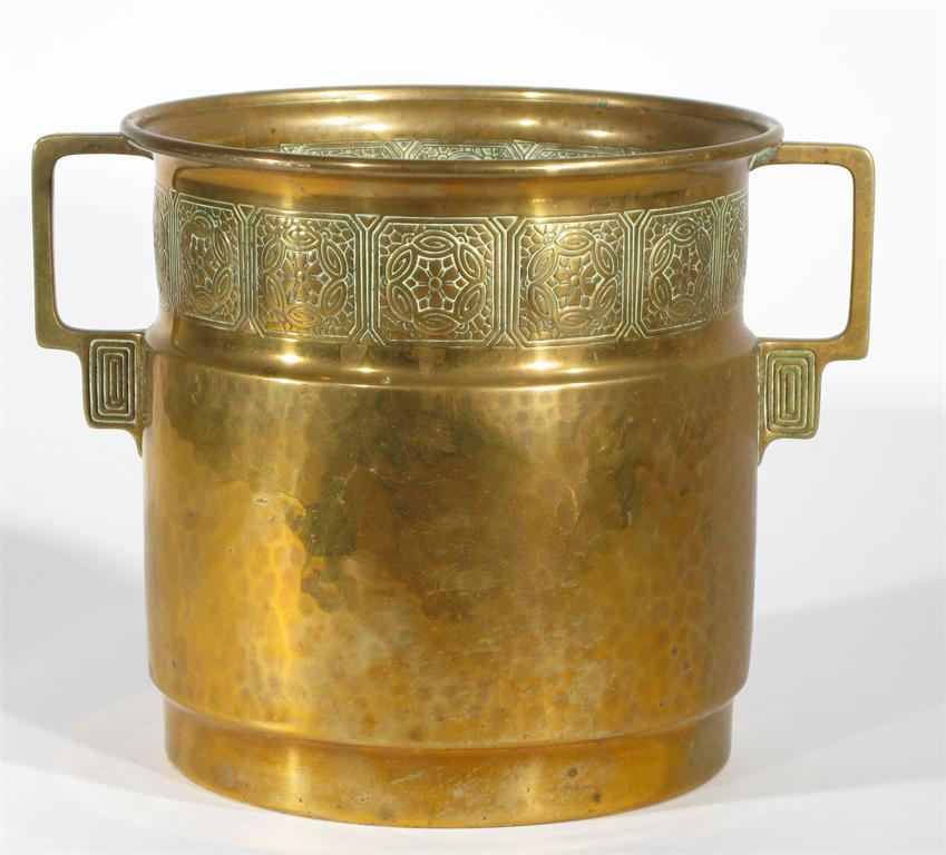 A W.M.F Secessionist brass jardiniere cast in low relief with stylised flower panels, with applied geometric handles stamped marks 21cm. high