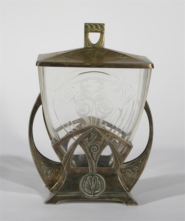 A WMF pewter and glass biscuit barrel rectangular section cast in low relief with floral panels