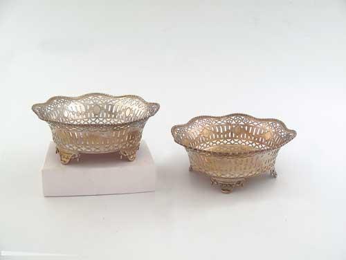 A pair of modern pierced bon bon dishes, shaped circular with wavy bobbin bead rims, engraved festoons and cast feet, by the Goldsmiths and Silversmiths Co, London 1913, 6in (15.5cm) diameter, 10oz.