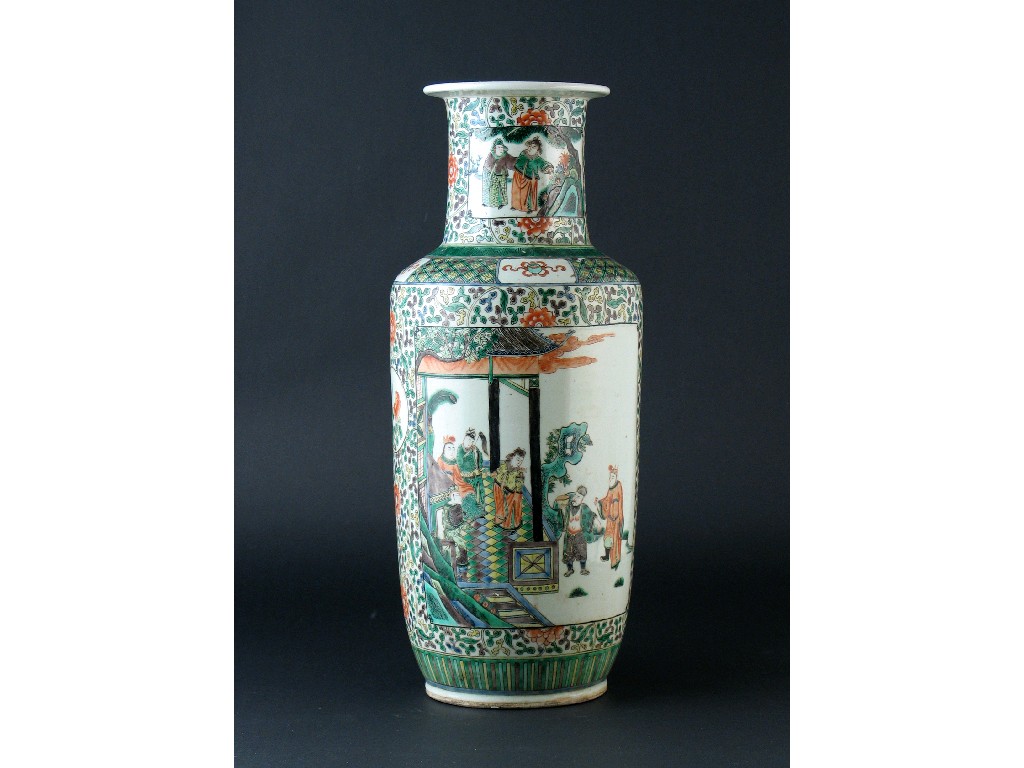 A Chinese famille verte rouleau vase, decorated with two panels containing courtiers and other figures on a ground decorated with scrolling foliage. A faint star crack to the base. 19th century, 45.5cm.