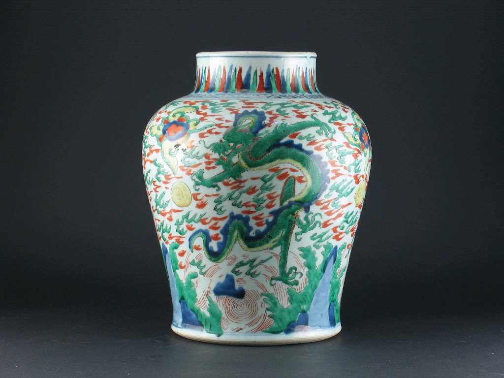 A Chinese w ucai baluster vase, brightly decorated with three dragons amidst stylized clouds in pursuit of pearls. A tiny well restored rim chip. Transitional c.1650, 33cm. High.