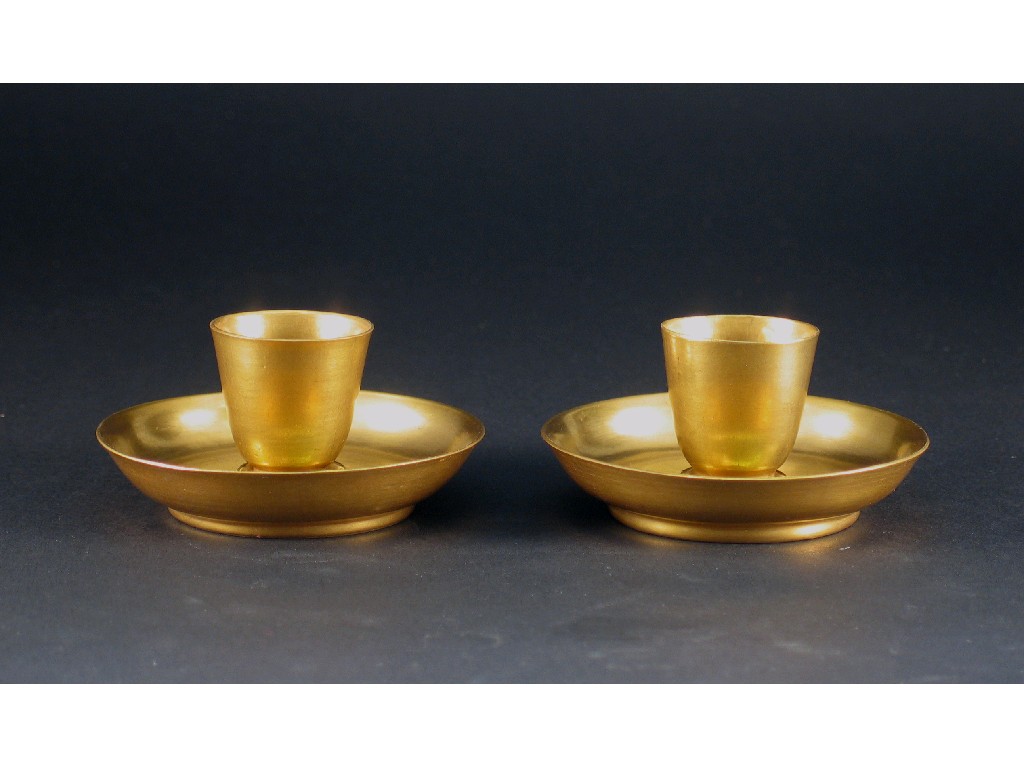 An unusual pair of Chinese gold-ground cups and stands, each with a flared U-shaped body with an overall gold glaze, 18th/19th century, 9.6cm. Max. (4)
