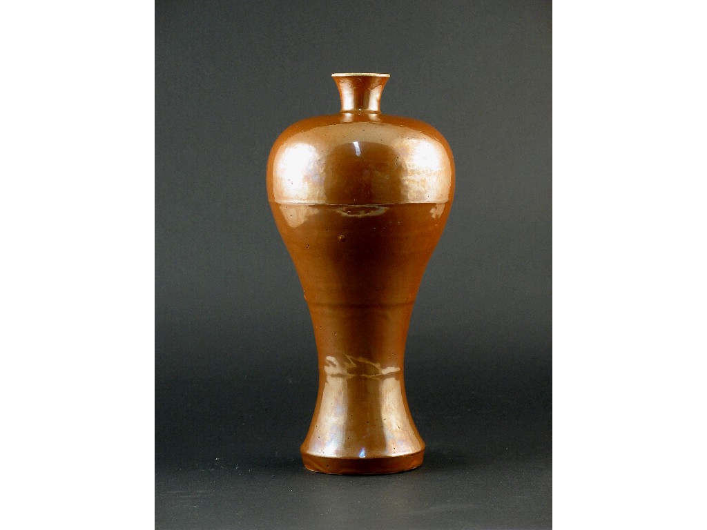 An unusual Chinese meiping vase, with an accentuated body constructed in sections and decorated with a lustrous brown glaze. A little grinding to the rim. Wanli six character mark and of the period, 1573-1619, 31.5cm.