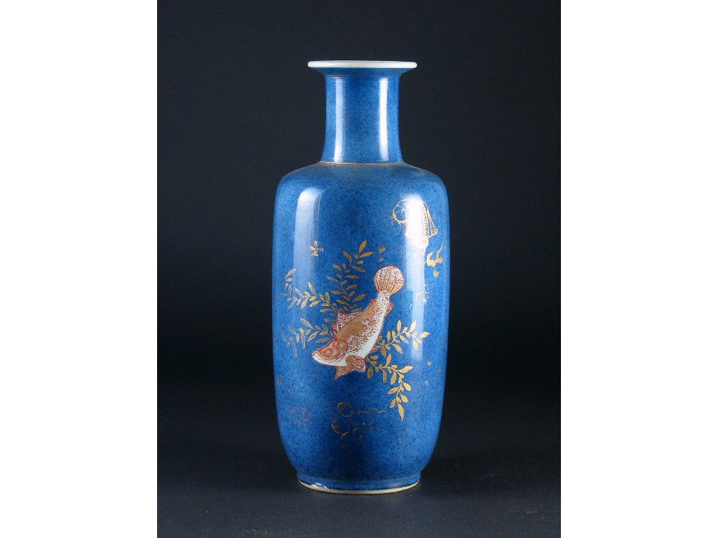 A Chinese powder-blue ground small rouleau vase, decorated in iron red and gilt with three fish, water weeds, shells and a diaper border around the shoulder, label for Spink & Son Ltd. Wear to the gilding. Kangxi 1662-1722, 26.2cm.
