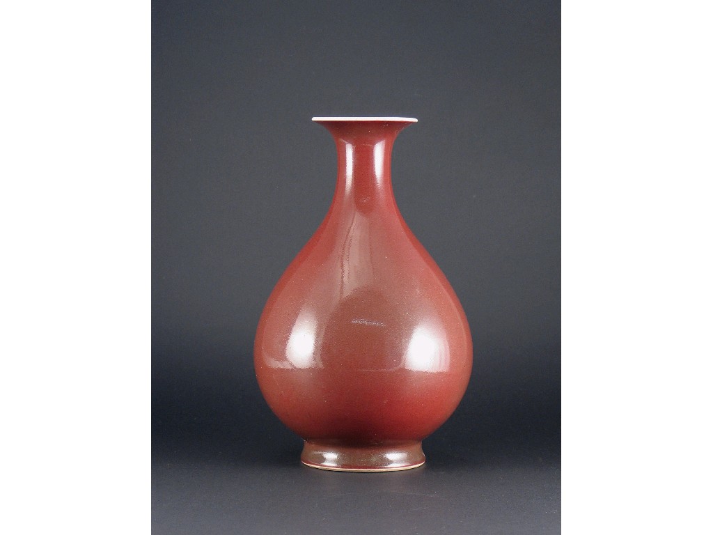 A Chinese copper-red pear-shaped vase, with a flared neck. The rim slightly polished. Six character seal mark for Daoguang and of the period 1821-1850, 30cm.