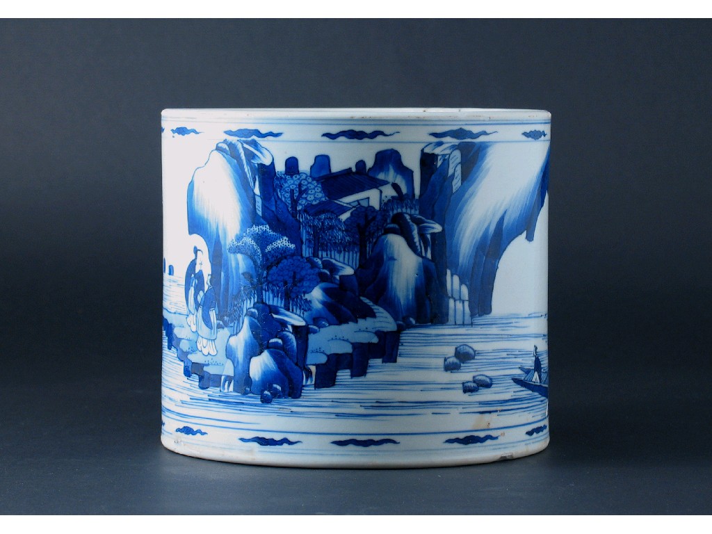 A Chinese blue and white cylindrical brush pot, decorated with a figures in a watery landscape. A hair crack. Kangxi 1662-1722, 17.5cm. Wide.