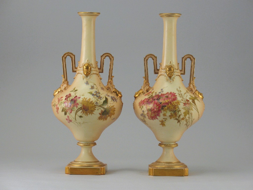 A pair of Royal Worcester vases, each decorated with flowers on a shaded ground, c.1900, 29.5cm. (2)