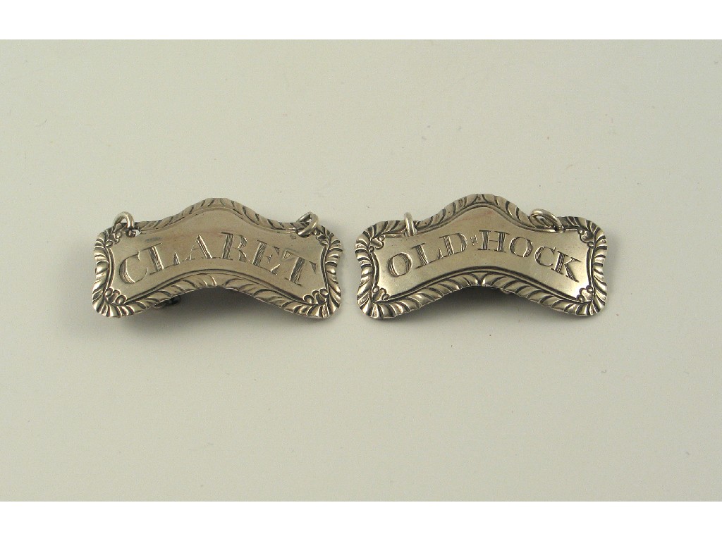 A pair of George III feather edge wine labels, " claret" and "old hock", by Margaret Binley, circa 1770, (2).