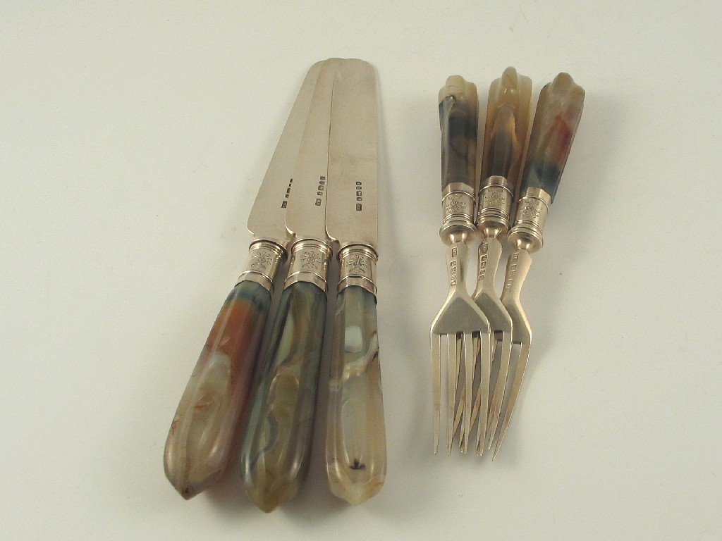 Twelve Victorian pairs of dessert knives and forks, with fluted agate handles, crested ferrules, maker H H Sheffield, 1871, (24).
