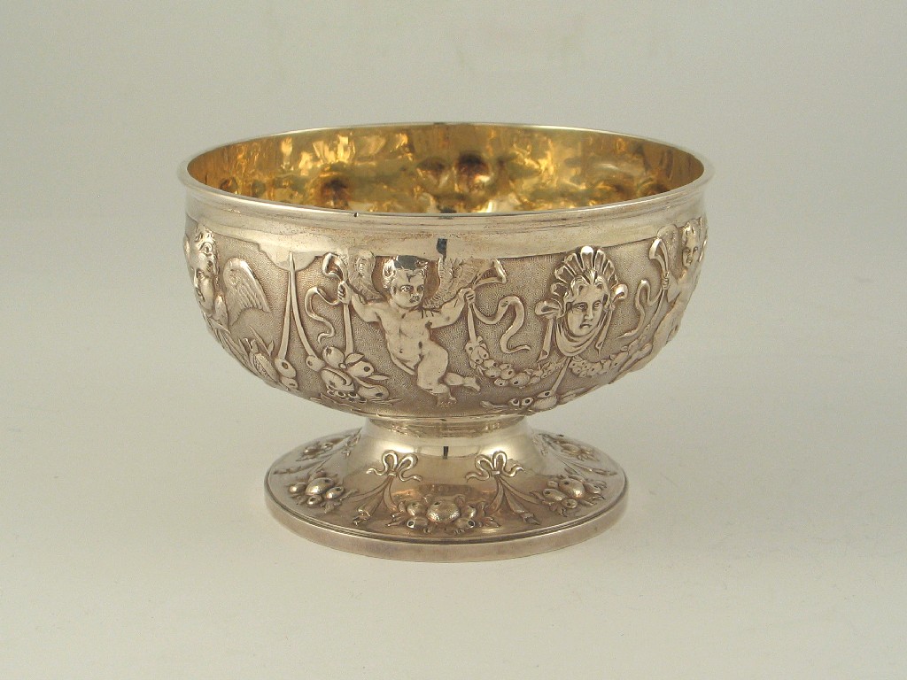 A Victorian cast circular bowl, with relief decoration, by H. W. Curry, 1876, 11.5oz.