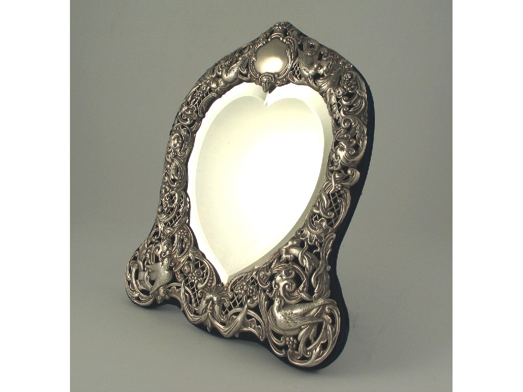 A Victorian heart shaped easel mirror, (relined), by William Comyns, 1895.
