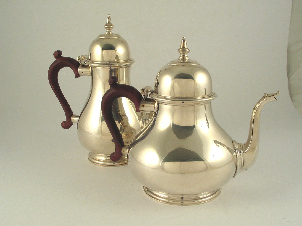 A modern pear shaped coffee pot and tea pot, by Asprey & Co Ltd, 1975, 42oz, (2).