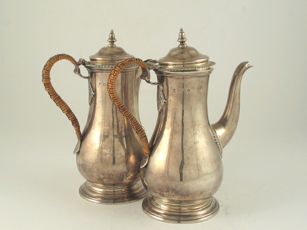 A modern baluster coffee pot and hot water jug, with cane-bound handles, by A & F Parsons, for Tessier, 1926, 36oz, (2).