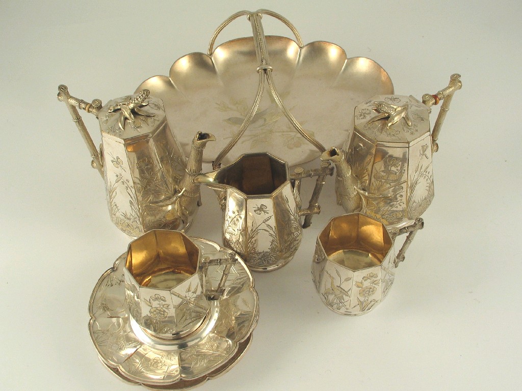 A Victorian plated aesthetic coffee set, comprising coffee pot, hot milk jug, cream jug and two cups and saucers, together with a non-matching plated basket.