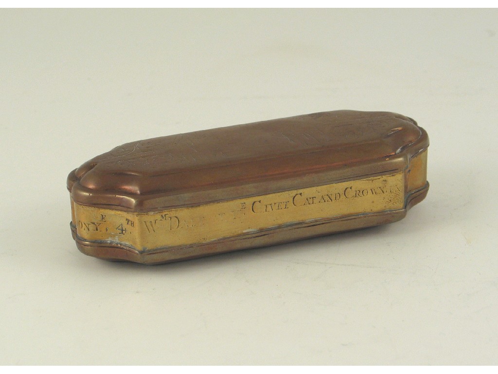 A George II brass and copper tobacco box, with engraving and an interesting inscription around the sides.