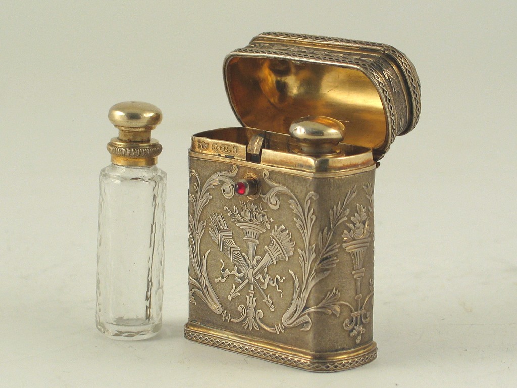 A continental parcel-gilt neccessaire a parfume, with cisele decoration, a hinged cover and a gem set thumb piece, import marks for 1906.