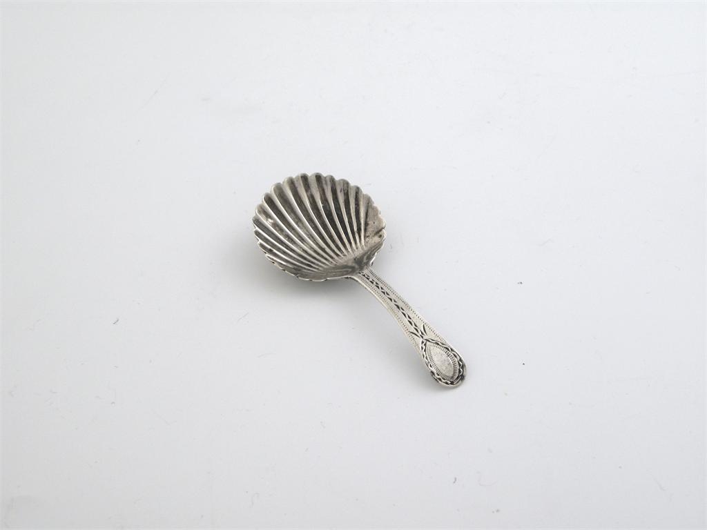 A George III provincial caddy spoon, shell bowl and bright cut stem, by Jason Holt, Exeter 1790.