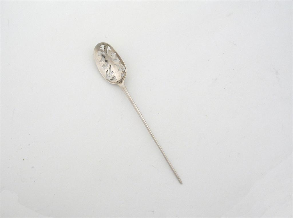 A George II rattail mote spoon, the bowl scratched EM, struck twice with the makers mark ?.S, perhaps Albert Schurman (see Grimwade 3478), c.1750-60, 5.25in (13.3cm).