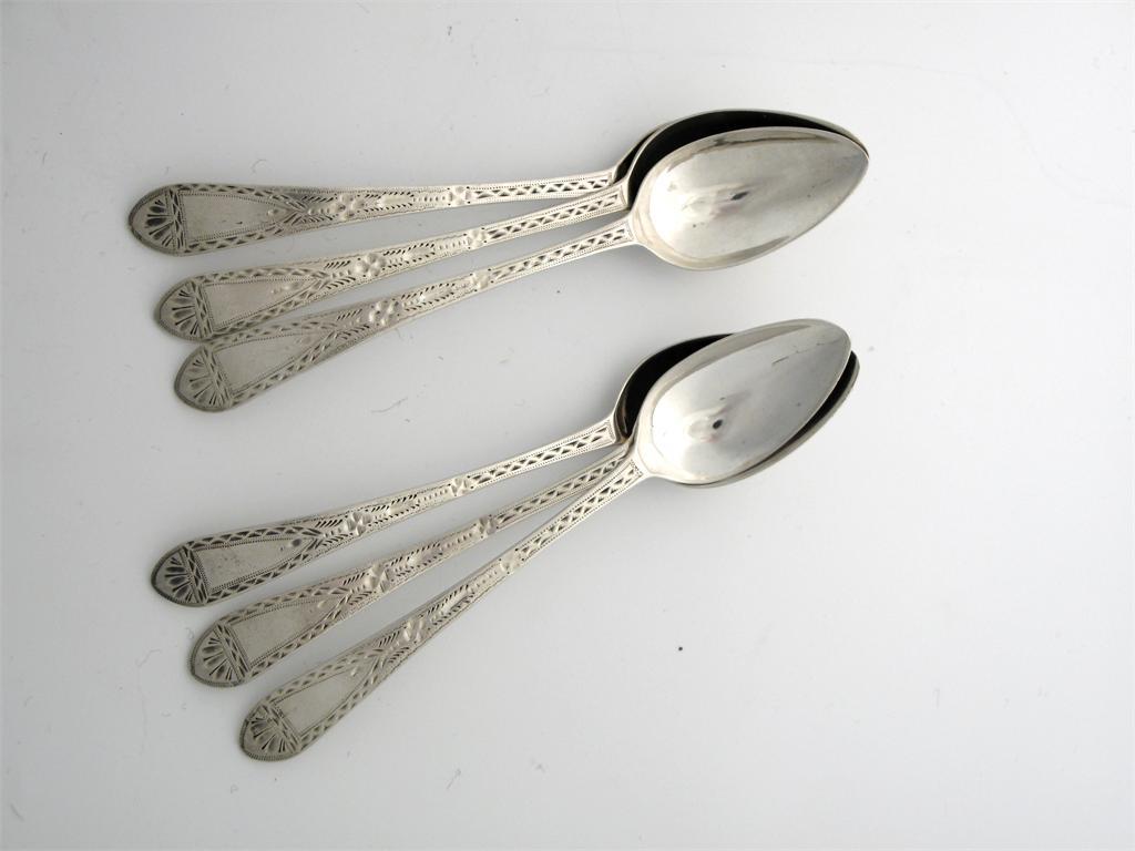 A set of 6 George III Scottish bright-cut teaspoons, with pointed terminals, by an unascibed maker 'RW', Edinburgh c.1800 (no date letter), 3oz. (6)