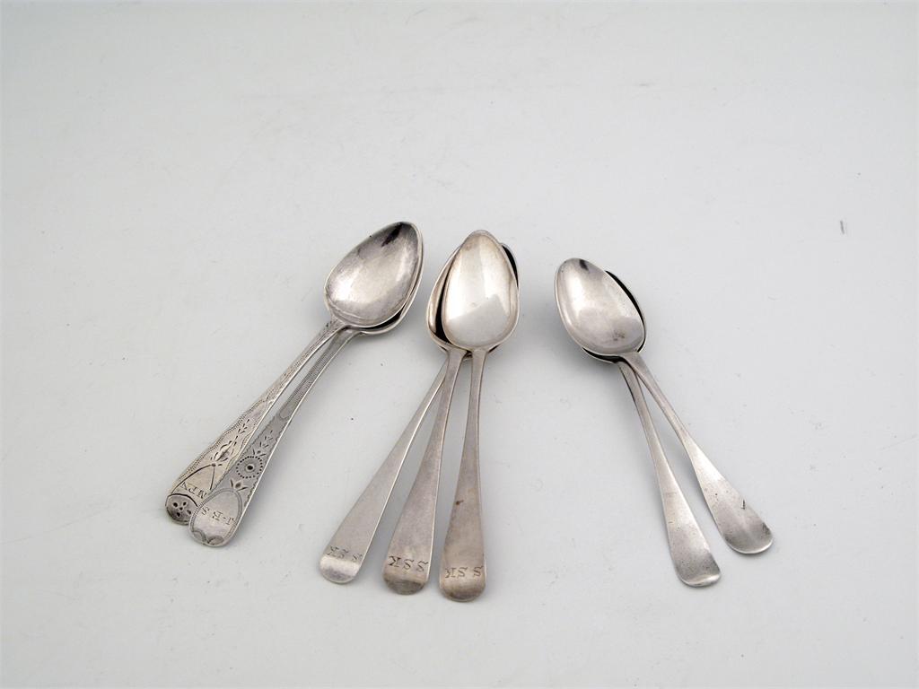 Channel Isles: 4 teaspoons (3 engraved SSK), by Jacques Quesuel, one by C.W. Quesuel and 2 shell beck (one by IL, one by Pierre Maingy). (7)