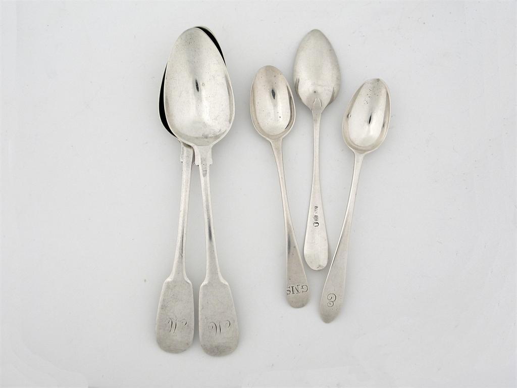 Aberdeen: a pair of fiddle pattern dessert spoons, by George Booth 1800-1820, alson two Edinburgh teaspoons, by Alexander Ziegler and Patrick Robertson, c.1800 and another by John Langlands, Newcastle. (5)