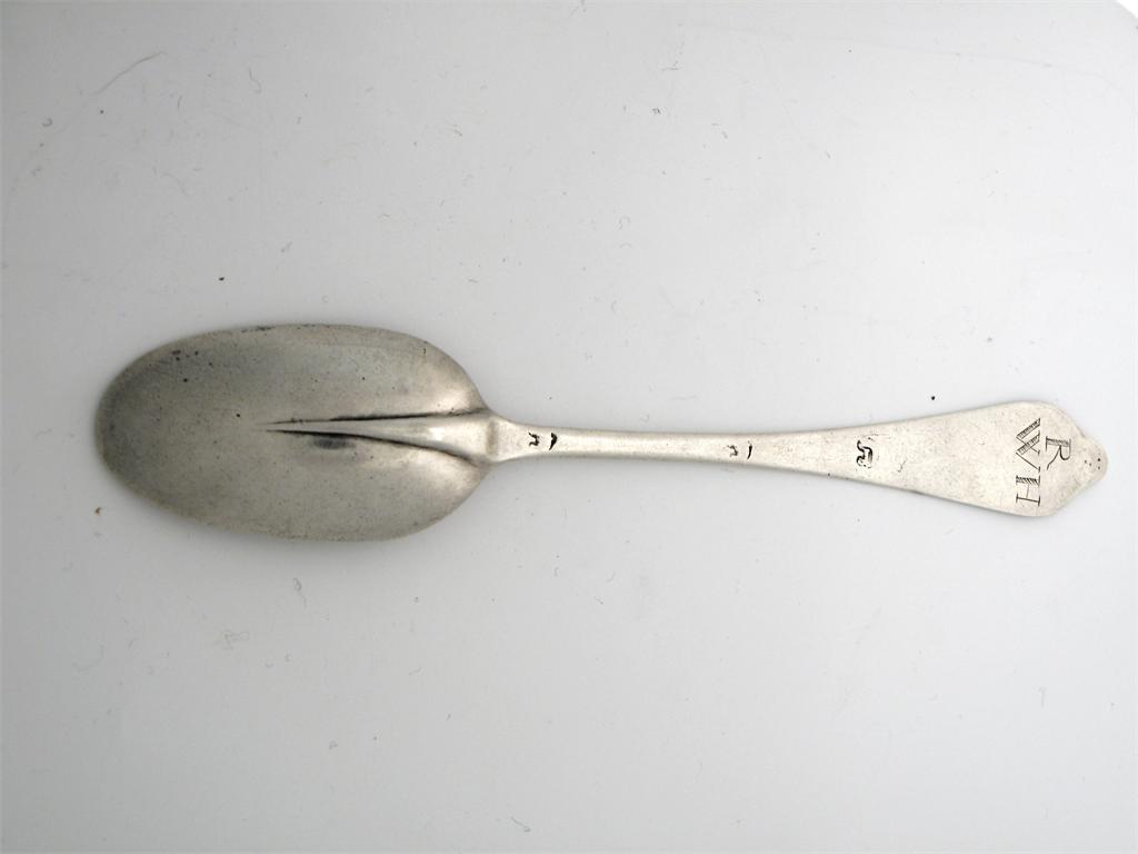 A Queen Anne unascribed provincial wavy end spoon, plain rattail bowl, scratched initials 'R' over 'WH' struck thrice with an indistinct mark (a gold fleece?), c.1705, 8in (20.2cm) long, 1.25oz.