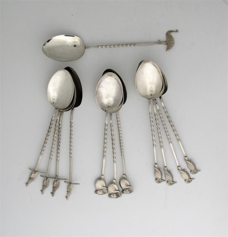 A set of 12/ Australian teaspoons, with twisted stems the terminals in the form of indigenous fauna (four kangaroos. three koala, an emu, and four kuccaaburra), no makers mark, 1920/30, 3oz (12).