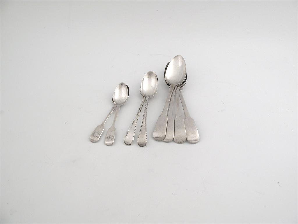 4 FIDDLE TABLESPOONS, 2 DESSERT SPOONS & 2 TEASPOONS (8) Four 19th Century Chinese export Fiddle tablespoons, by Kheechong, a pair of Exeter-made Fiddle teaspoons and a pair of George III dessert spoons, 11oz. (8)