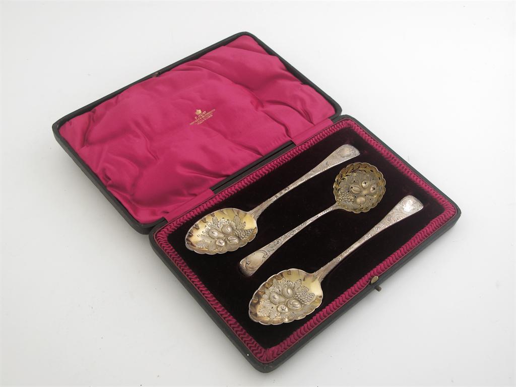 A late Victorian cased set of three 'berry' spoons, (a pair of servers and a sifter ladle - all later decorated antique spoons with gilded bowls), 3oz.