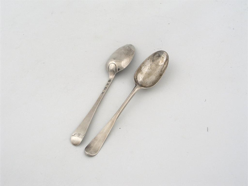 A pair of George III Scottish tablespoons, Hanoverian pattern, initialled 'AS', possibly by John Edmonston, Edinburgh 1771, 4.5oz. (2)