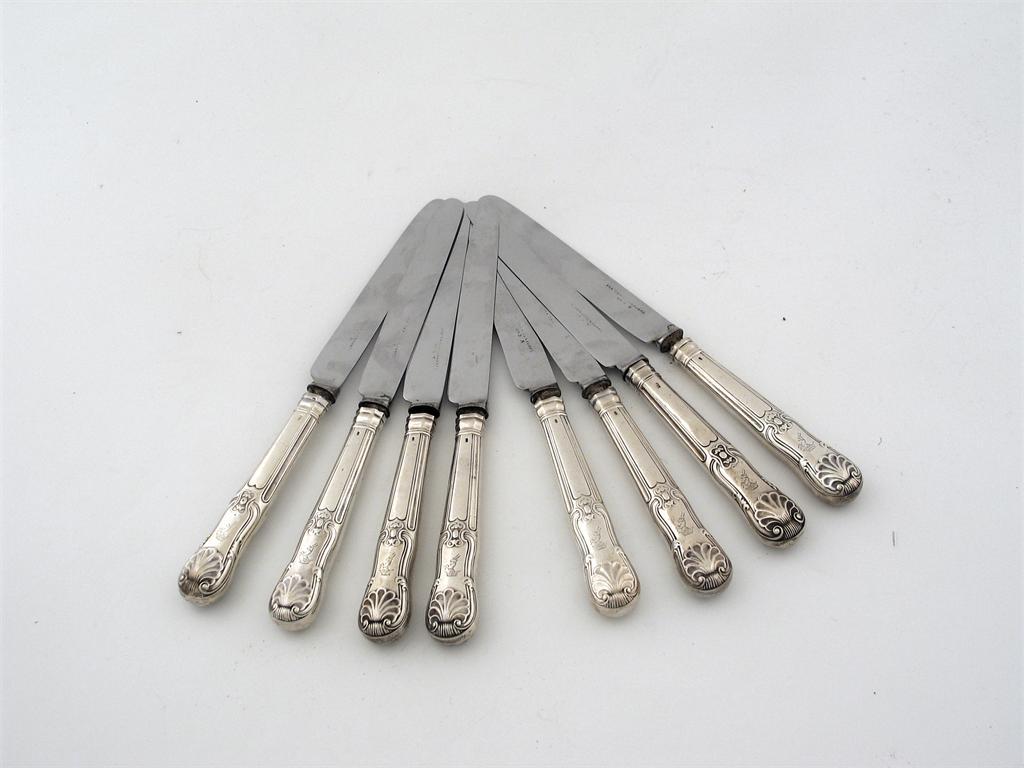 By Paul Storr: a set of 6 George III hourglass pattern tableknives, crested, London 1820 together with a pair of Victorian knives to match, by Francis Higgins, London 1844 (polished steel, finger point blades). (8)