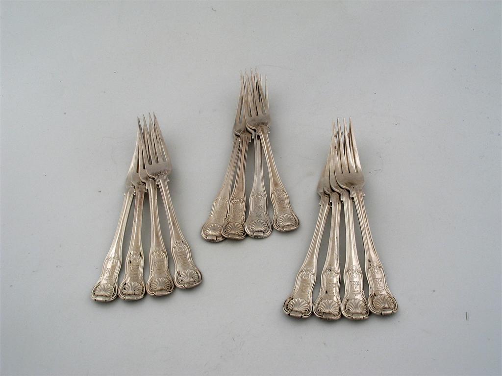 Royal Association: a set of 10 early Victorian hourglass pattern tableforks, by Mary Chawner and George Adams, London 1840*, and 2 to match by John Lias, London 1817, all engraved with Queen Victorias Royal Insignia and a Viscounts crest and coronet, 41oz. (12) *Mary Chawner and George Adams partnership, lasted only during the year of 1840, due to the death of the former.