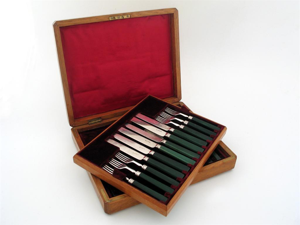A George IV cased set of 12 pairs of dessert knives and forks, with green stained ivory handles, by Aaron Hadfield, Sheffield 1823.