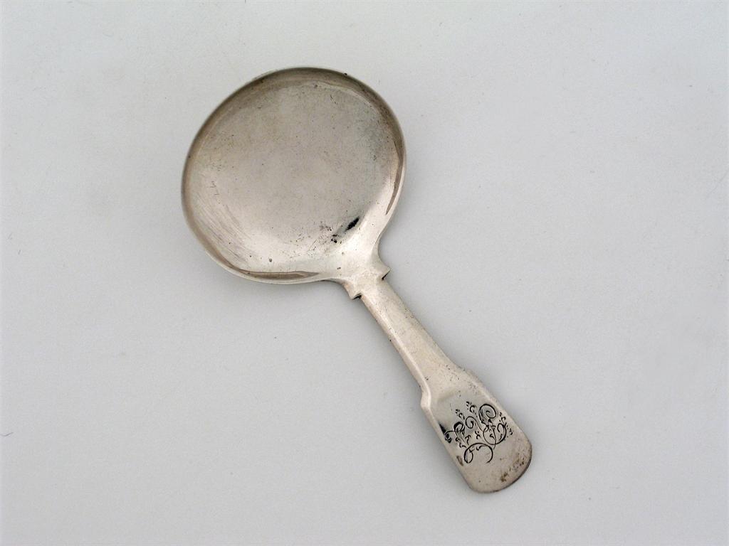 A William IV fiddle caddy spoon, with a shallow circular bowl, initialled 'RL', by Francis Powell, London 1833.
