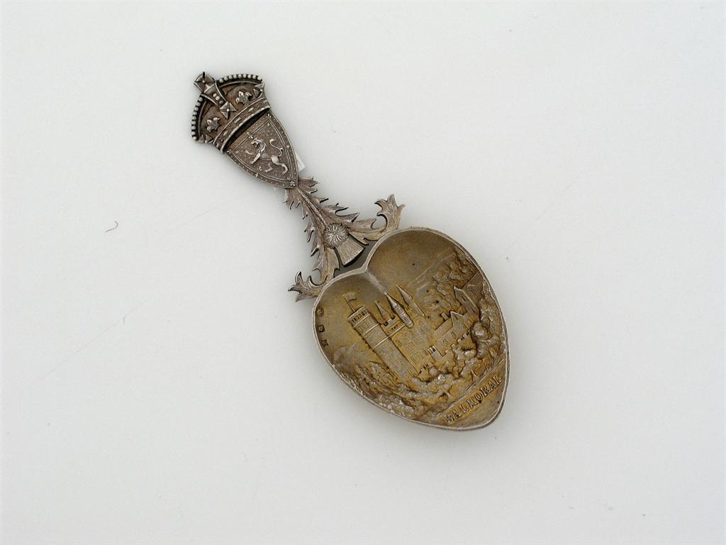 By William Robb of Ballater: a modern cast triangular gilt souvenir caddy spoon 'Balmoral', with Edinburgh hallmarks for 1921.