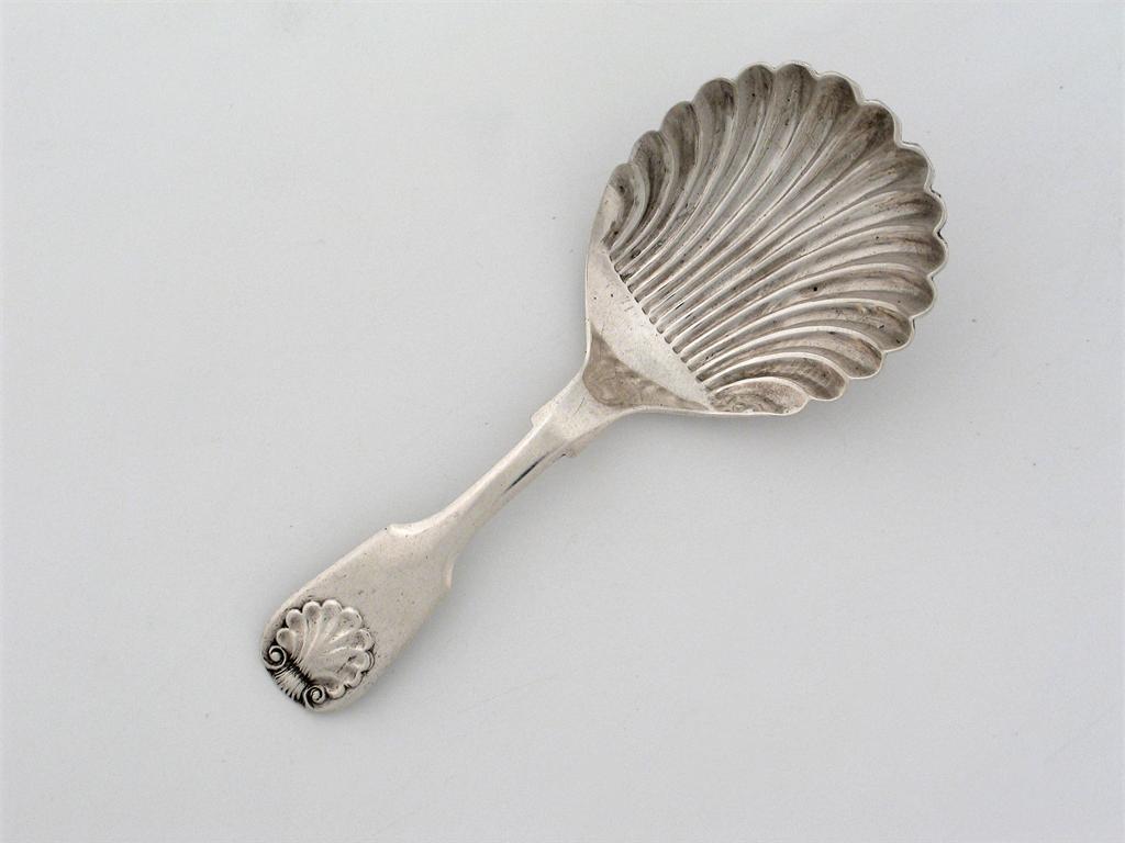 A Victorian Scottish caddy spoon, with fiddle and shell stem and a fluted bowl, by William Marshall Edinburgh 1844.