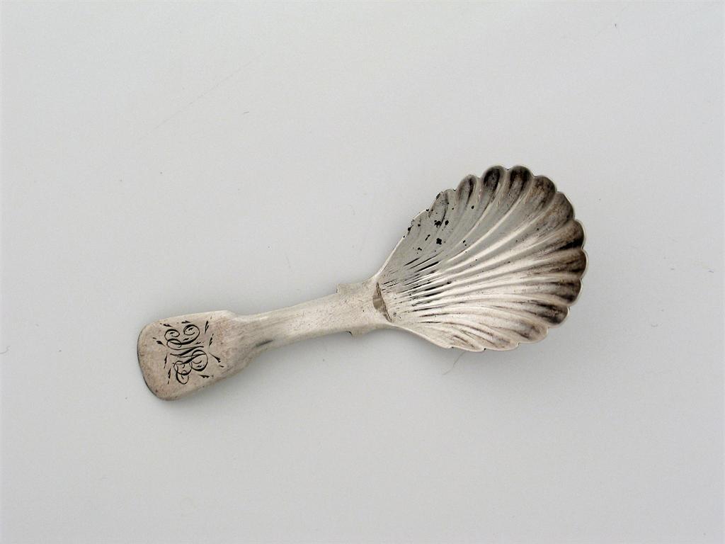 A William IV provincial fiddle caddy spoon, fluted bowl, initialled 'EWC', by Peter Lambert (of Berwick upon Tweed) with Newcastle mark for 1836.
