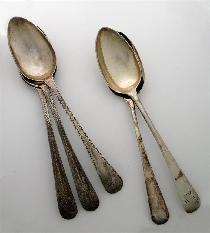 A pair of George III bright cut tablespoons, initialled by Thomas Wallis (II), London 1782 together with two tablespoons, by Hester Bateman, London 1775 and 1784 (one initialled and dated 1788) and a bright cut tablespoon, initialled by Peter & Anne Bateman, London 1791, 10oz. (5)