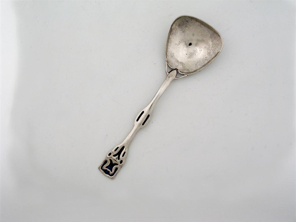 An art nouveau spoon, with grain shovel bowl, with panels of blue and green enamel, by William Mutton and Sons Ltd, London 1903, 7in (18cm).