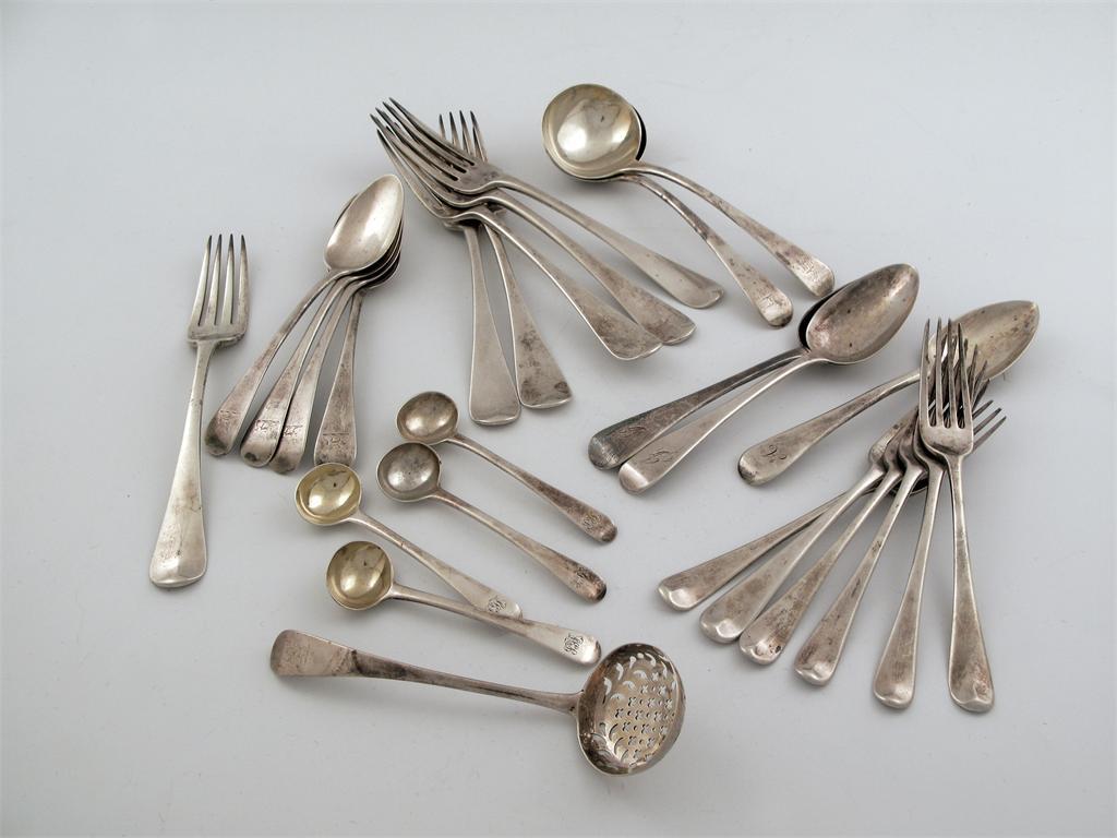 Old English pattern flatware, George III-George IV: six tableforks, six dessert spoons, a pair of sauce ladles, four salt spoons and a sugar ladle, some crested or initialled, mixed makers and dates, London 1806-1821, 33oz. (26)
