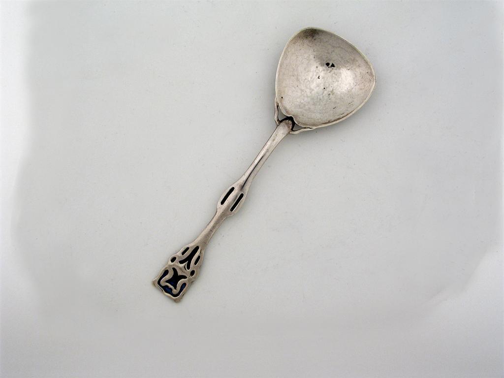 An art nouveau spoon, with grain shovel hammer bowl, the moulded handle with panels of blue and green enamel, by William Fenton & Sons Ltd, London 1903, 7in (18cm).