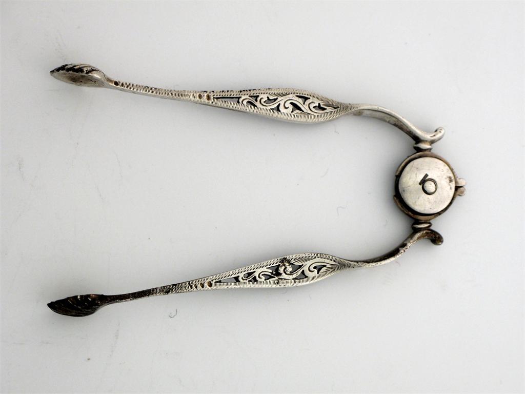 A pair of Victorian pierced sugar tongs, with a 'spring' disc pivot, by Francis Higgins, London 1890, 3.75in (9.5cm) long, 0.6oz
