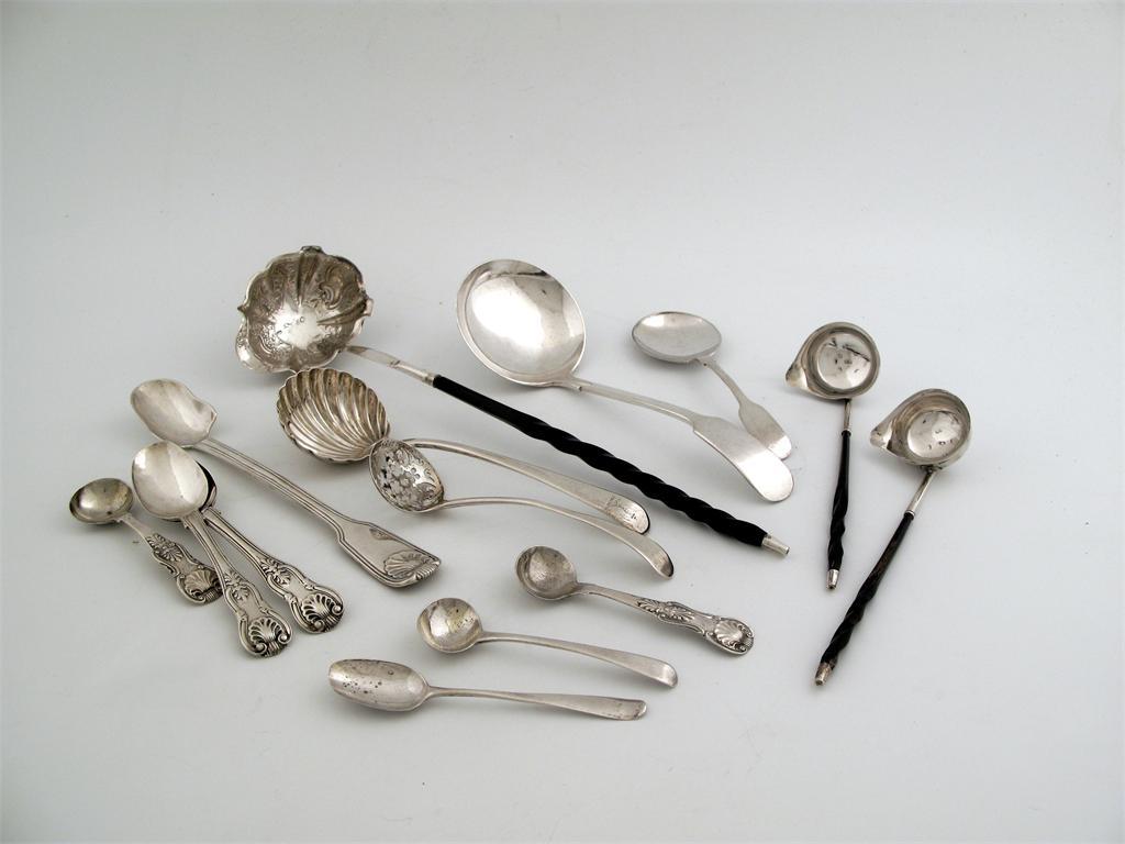 Mixed flatware: six assorted ladles, George III modern, a pair of Newcastle made salt spoons, another salt spoon, a cheese scoop, 3 teaspoons and sugar sifter ladle.