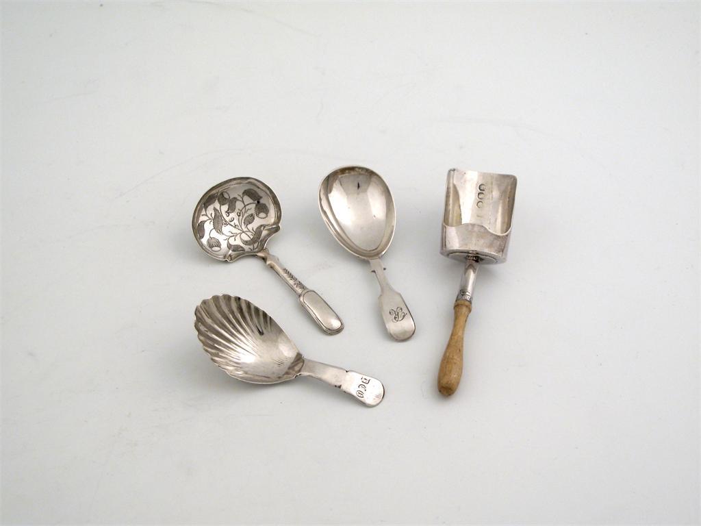 Four caddy spoons: a George III bone handled scoop, London 1818, a kidney shaped example with engraved bowl, and hollow fiddle stem, by Joseph Wilmore, Birmingham 1828 and two other examples.