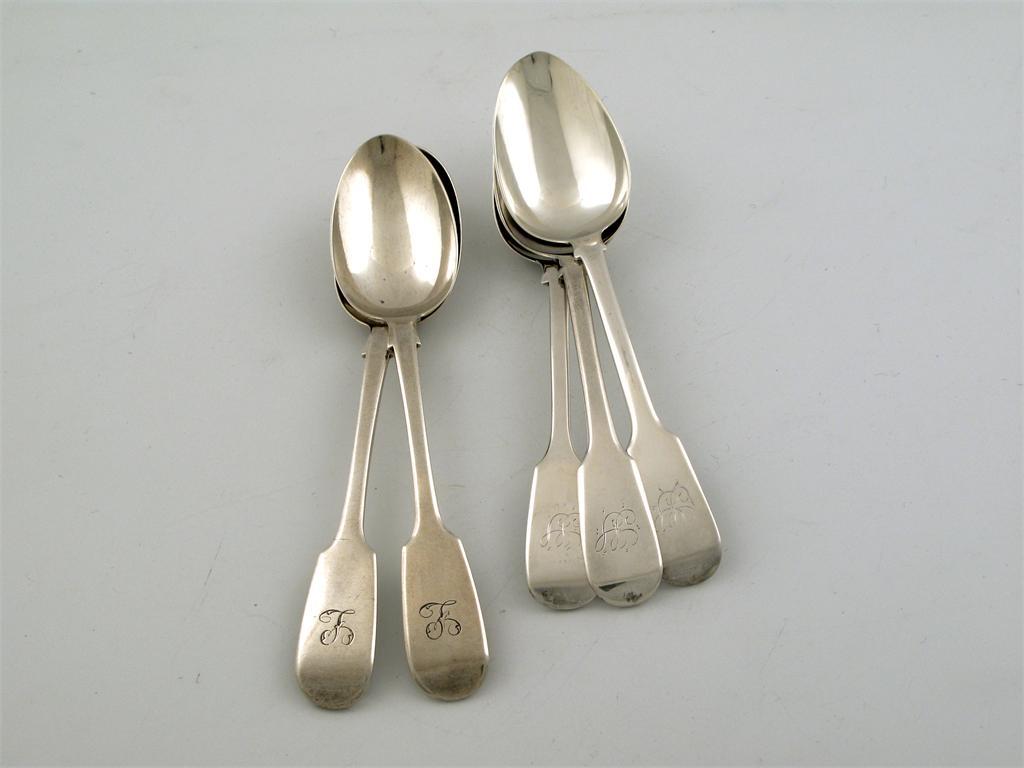Paul Storr. Three Fiddle Pattern Dessert Spoons, engraved 'ss', London 1807 and a pair for W.R. Smily, London 1836, 6ozs (5).